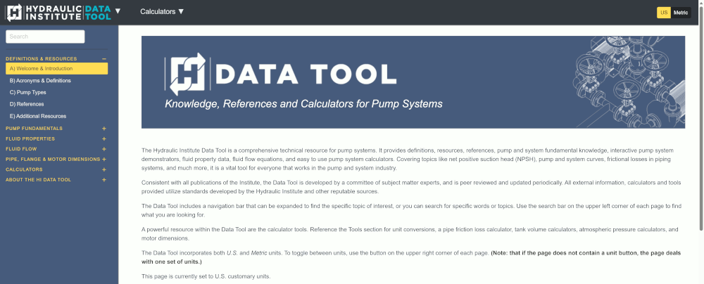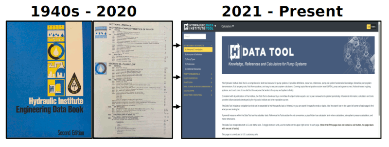 In 2021, the HI created an initial release of a pump systems information data tool named the “HI Engineering Data Library”. The data library was modeled after the HI Pipe Friction Manual and the subsequent Engineering Data Book, which originally dated back to the 1940s, but a key objective at HI was to provide more modern resources in a format that served a new generation of engineers. A few years later in 2024, HI released a second version of the tool that was branded “HI Data Tool”. The new version restructured the navigation menu and added a preface section covering definitions, pump types, references and resources. HI also renamed the section headings and reorganized sub-sections.