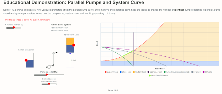 Shown below is an example from the Interactive Parallel Pump and System Curve Demonstrator that illustrates how system curves change with varying levels, pressure and frictional losses, and how the pump curve and operating point varies with additional pumps operating at varying pump speeds.